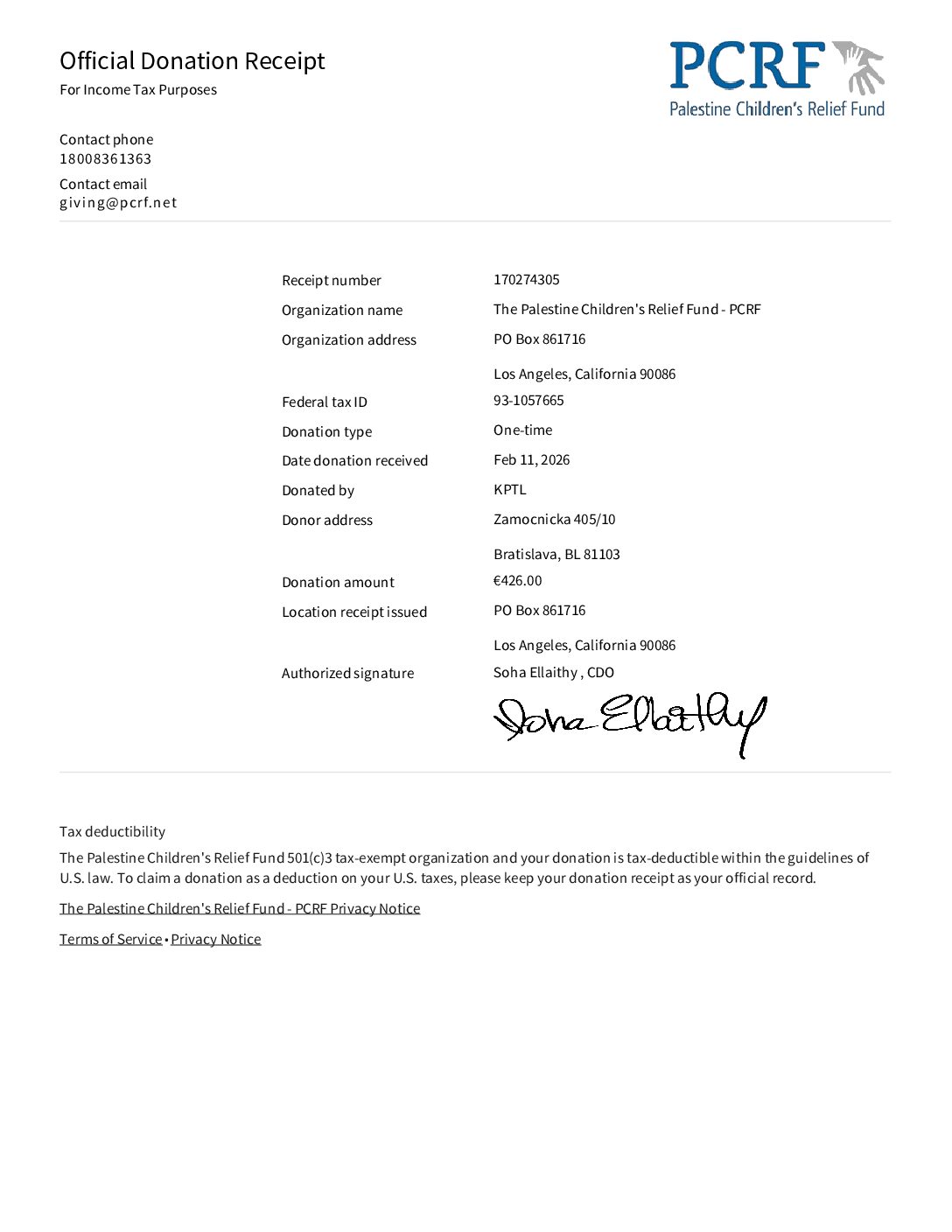 3. Palestine Children’s Relief Fund platba 03/2026: 426,00 eur